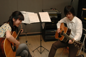 アコースティックギターのレッスン風景です。ピックや指弾きは最適な音量を出して練習します。